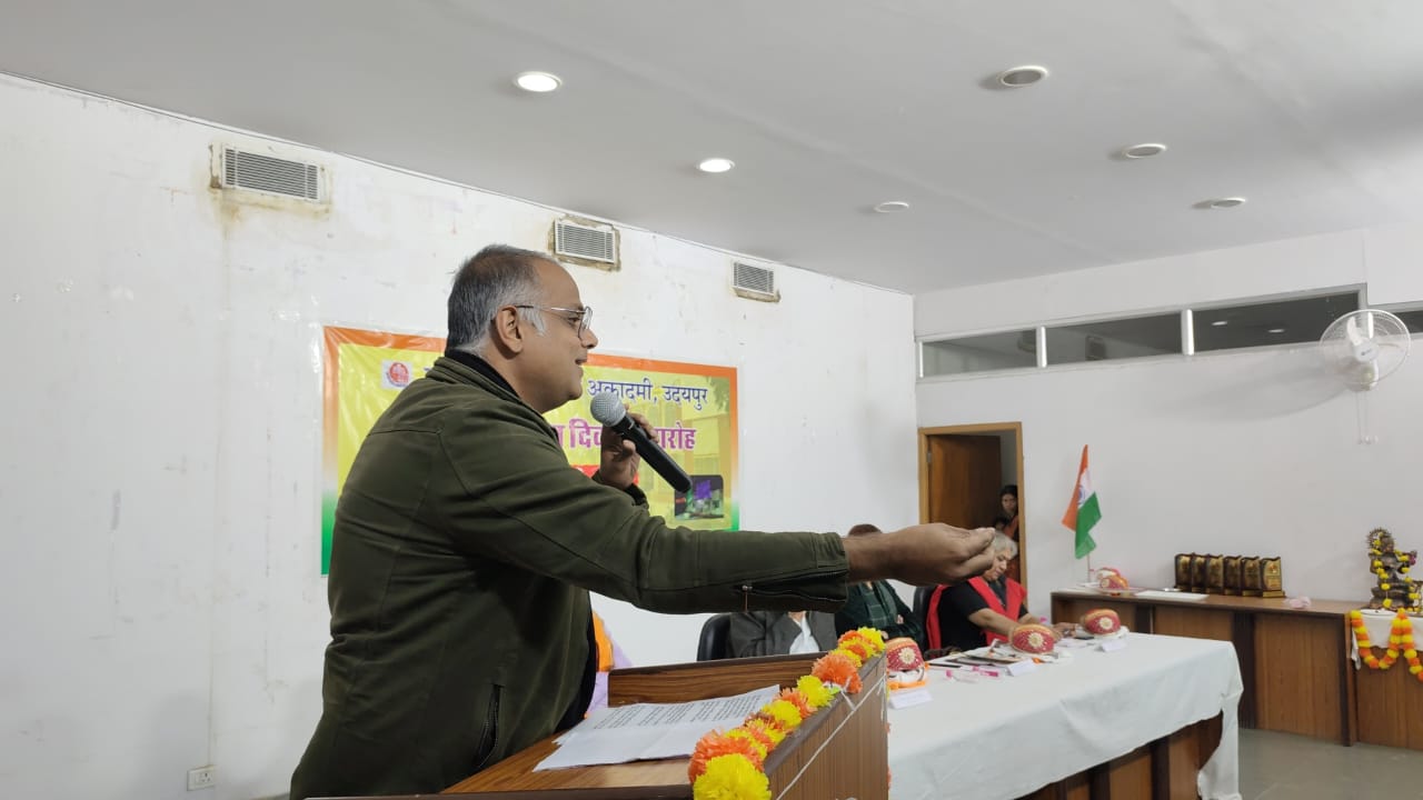मुख्य अतिथि विष्णु शर्मा ‘हरिहर’ ने अपने संबोधन में कहा, “साहित्य समाज का दर्पण है, लेकिन आज बाजारवाद, सोशल मीडिया की भागदौड़ और व्यावसायिकता के कारण साहित्य की गहराई प्रभावित हो रही है। अकादमी जैसी संस्थाएँ इन चुनौतियों से जूझने में महत्वपूर्ण भूमिका निभा सकती हैं। हमें साहित्य को केवल मनोरंजन नहीं, बल्कि सामाजिक चेतना जगाने का माध्यम बनाना होगा। राजस्थान की समृद्ध लोक-साहित्य परंपरा को आधुनिक संदर्भों में जीवित रखना हमारी जिम्मेदारी है।”